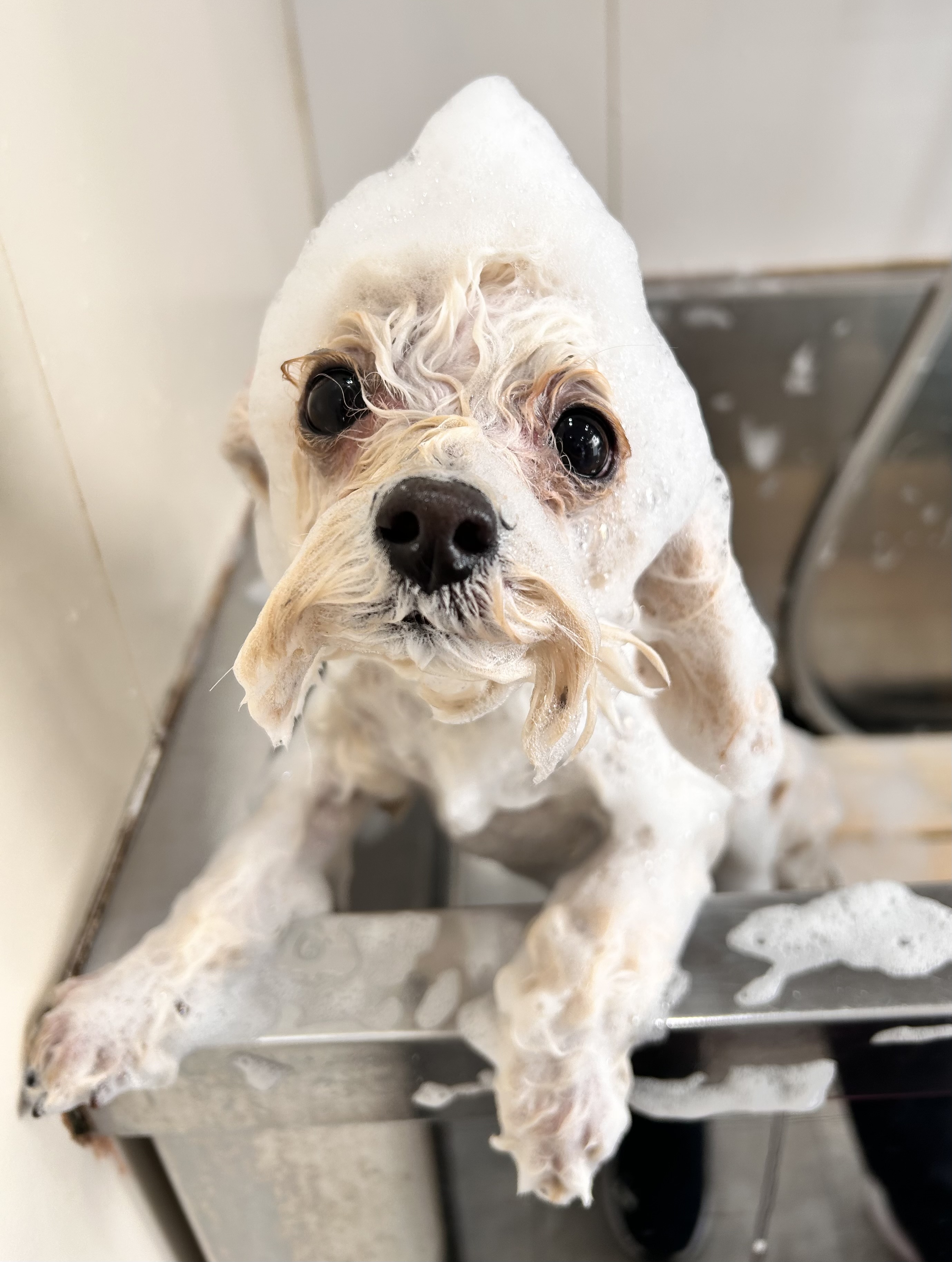 まず爪切り、足裏カット、耳掃除、ブラッシングを済ませてからシャンプーをしていきます![]()